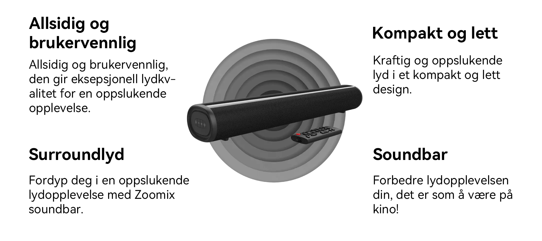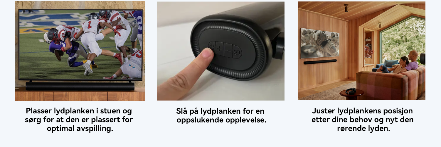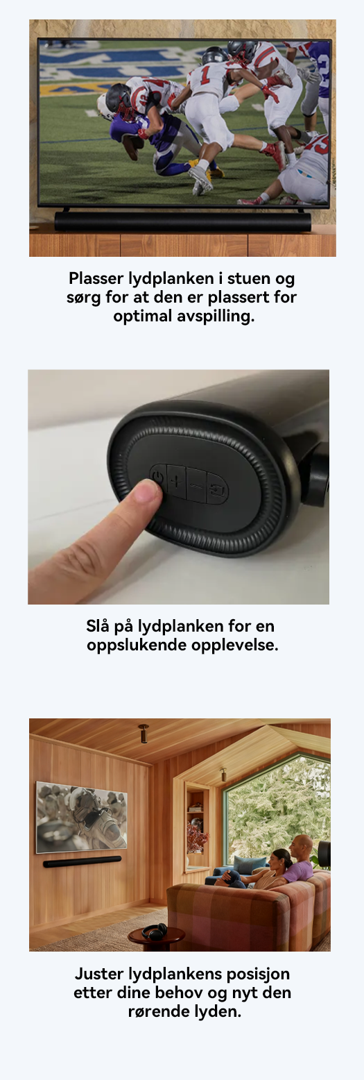 Soundbaren leverer eksepsjonell lydkvalitet som gir deg en surround-lydopplevelse, og fullstendig forvandler måten du nyter filmer, musikk, favorittsport og spill på.